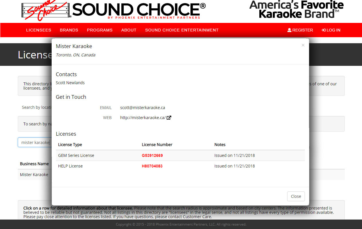 ![]() LICENSED MUSIC CATALOGUE:In addition to regularly investing into the expansion of the already substantial music library, MISTER KARAOKE is a proud registered licensee of both the Sound Choice GEM collection as well as the HELP program - in order to thwart the detriment of digital piracy and ensure that all music creators are fairly compensated. Sound Choice has been an industry leader since its inception in 1985 and karaoke audiences have come to trust them for the superb quality of the instrumental and lyric tracks which they produce. click here to view license information |